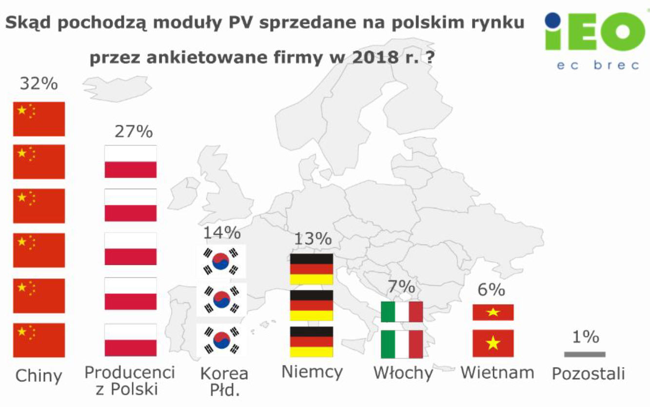 Niemal jedna trzecia modułów fotowoltaicznych sprzedawanych w Polsce w 2018 r. importowana była z Chin. Bezpośrednio od polskich producentów pochodziło ok. 25% sprzedanych modułów. Znaczny udział w rynku miały również moduły PV importowane z Korei Południowej oraz z Niemiec, coraz mniej z Włoch oraz z Wietnamu.